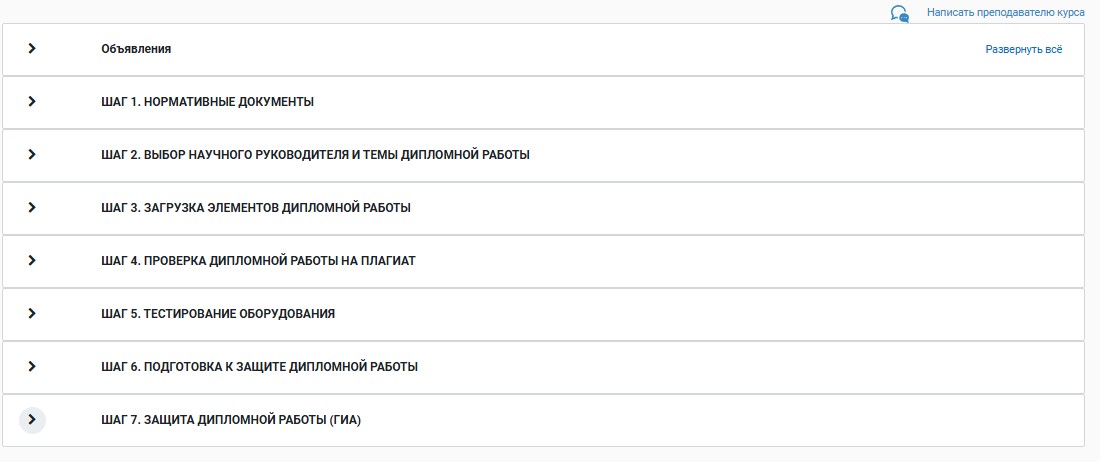 Во время подготовки ВКР учащийся поочередно отправляет преподавателю части работы через чат в СДО. После того как все разделы готовы, работа собирается в единый документ. К ней добавляются: